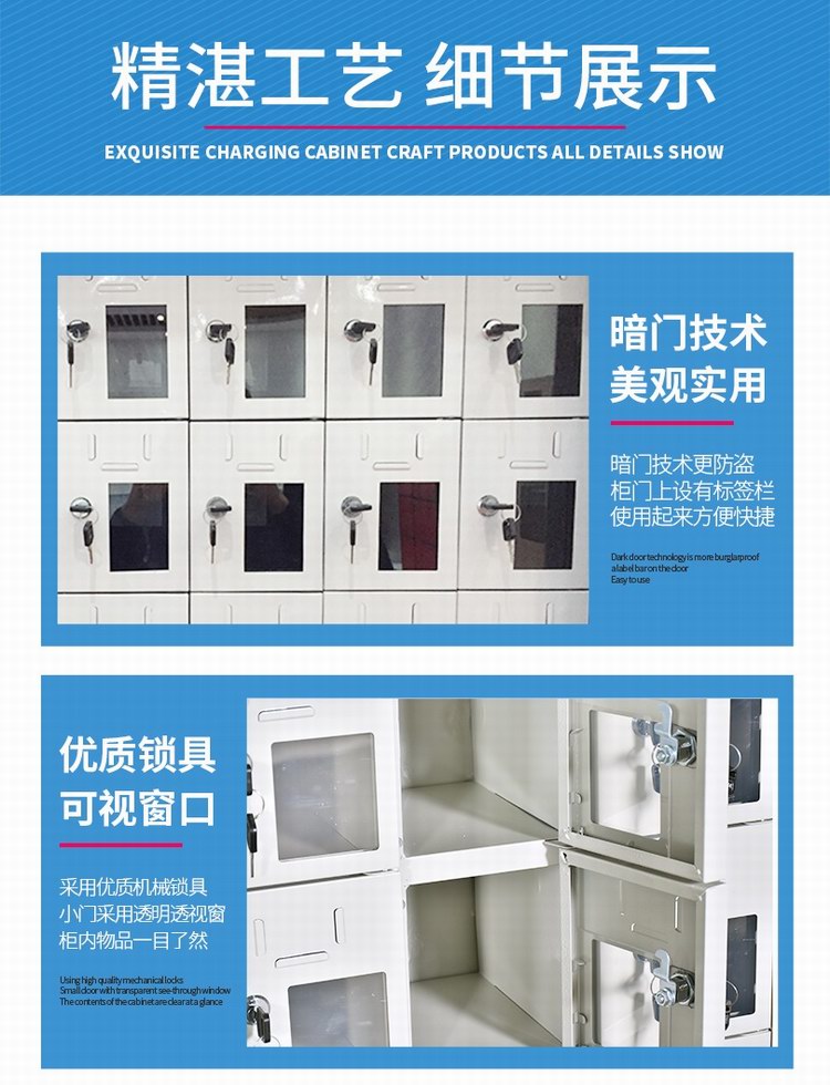 小門設(shè)計(jì)單獨(dú)鎖具,單柜單開(kāi),可實(shí)現(xiàn)一人一鎖;上方設(shè)計(jì)標(biāo)簽卡槽,便于粘貼姓名銘牌等信息,方便識(shí)別與管理,右下部設(shè)計(jì)透明亞克力觀察窗,便于觀察手機(jī)存放情況;內(nèi)部采用暗門折邊設(shè)計(jì),有效防止刮手。