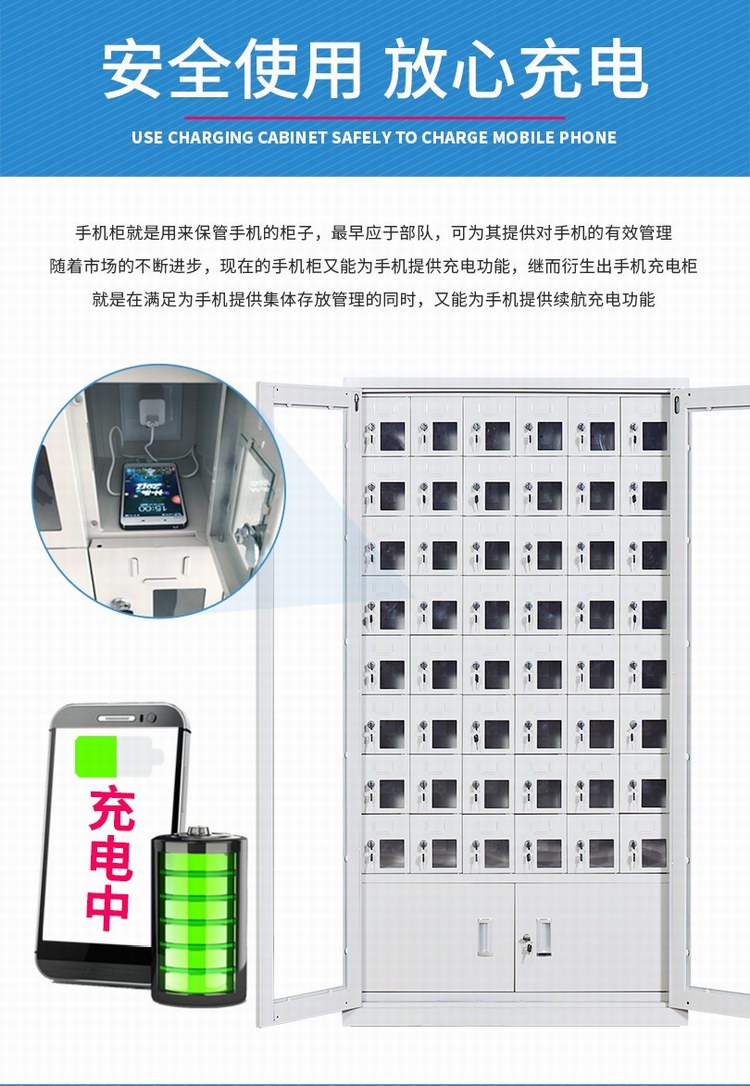 手機(jī)保密柜正面為對(duì)開(kāi)金屬邊框玻璃大門,便于觀察柜內(nèi)情況,堅(jiān)固透亮,美觀大方。